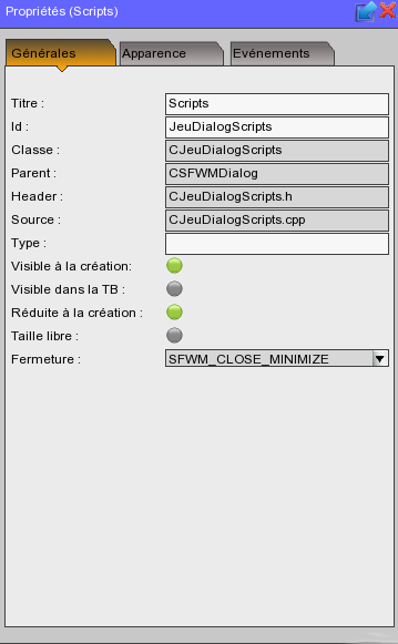 Dialogue SFWM permettant de voir / modifier les propriétés des dialogs ou des contrôles :