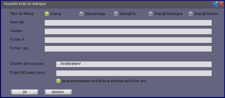 L'éditeur permet de créer de nouvelles fenêtres (boites de dialogue). Plusieurs types prédéfinis sont disponibles. L'intégration à QtCreator est parfaite et SFWM vient modifier le fichier pro de QtCreator afin d'ajouter les fichiers de classes auto générés au projet.